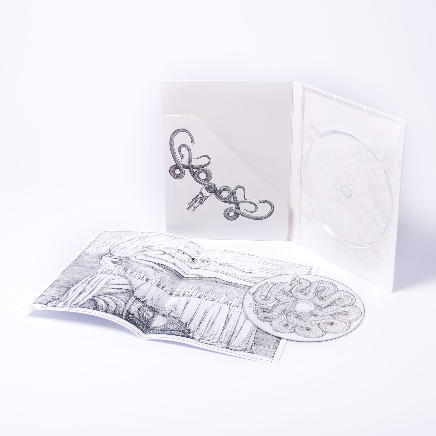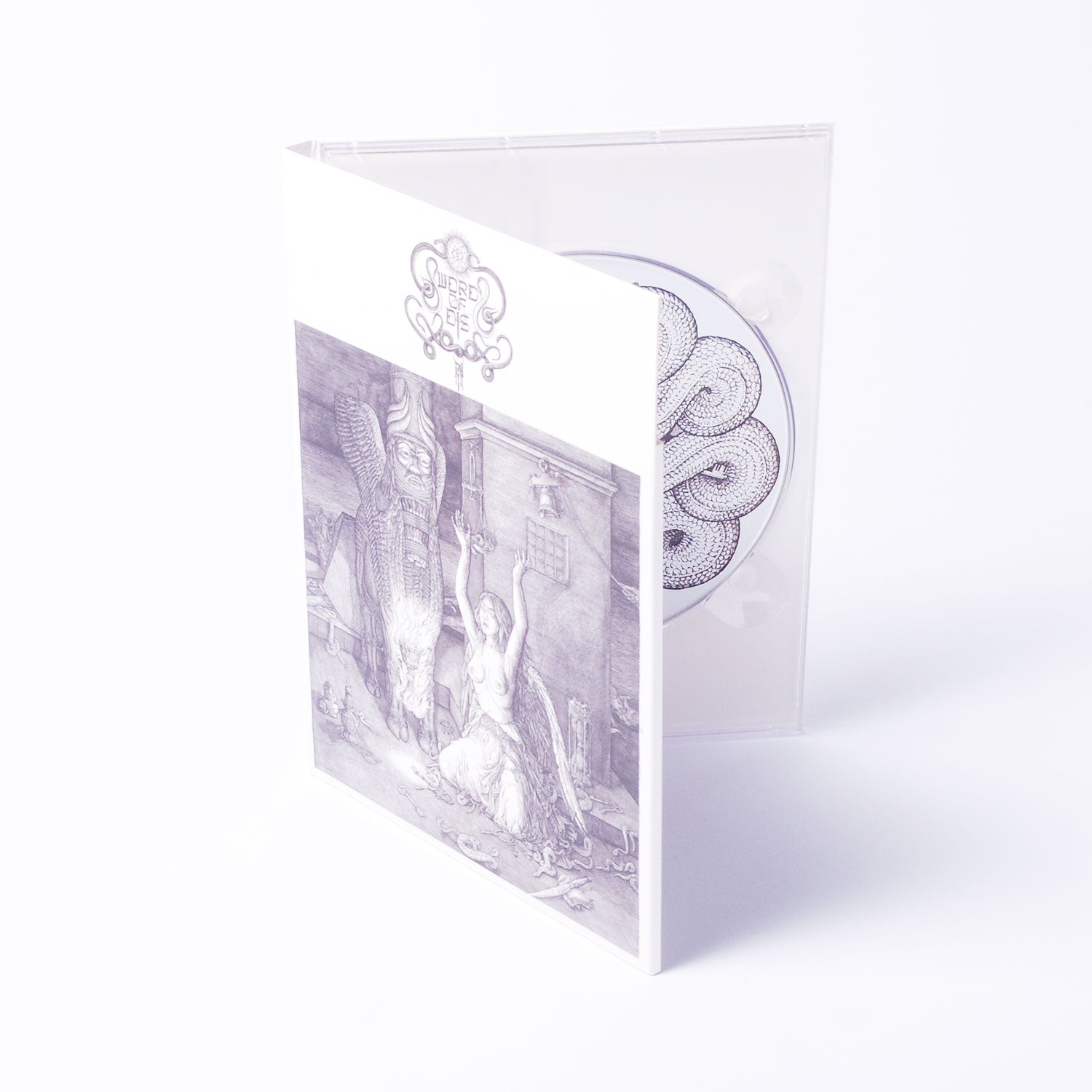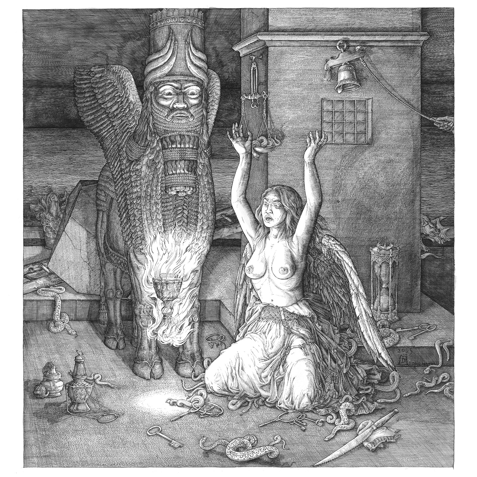 The amazing album cover by David Glomba is the direct follow on to Albrecht Durer’s "Melencolia I" and depicts the events that proceed the original engraving. Melancholy is now akin to Lucifer enshrined, asking for guidance through ritual and worship from the Chalice of Eternal Fire.